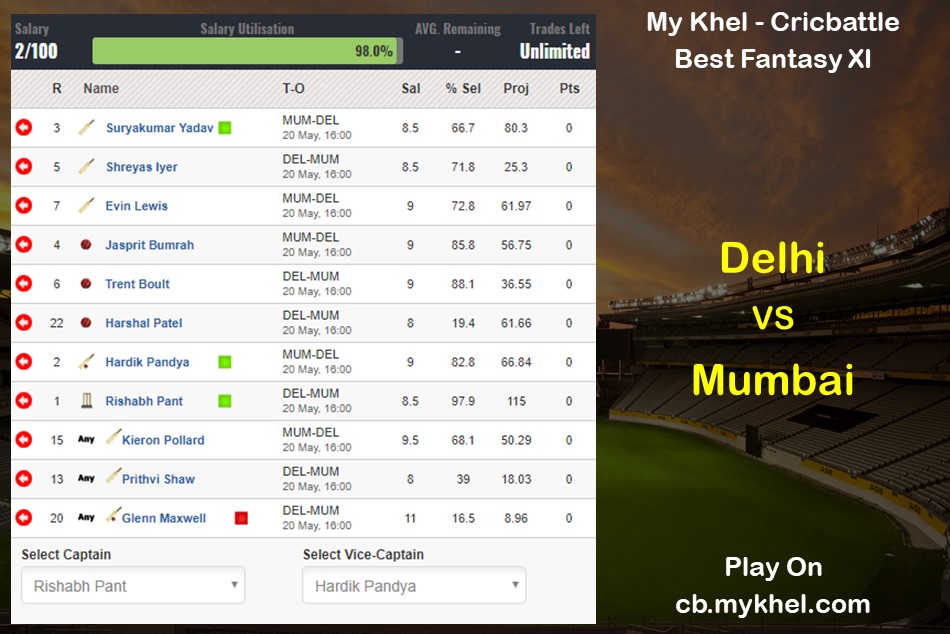 My Khel Fantasy Tips - Delhi vs Mumbai on May 20