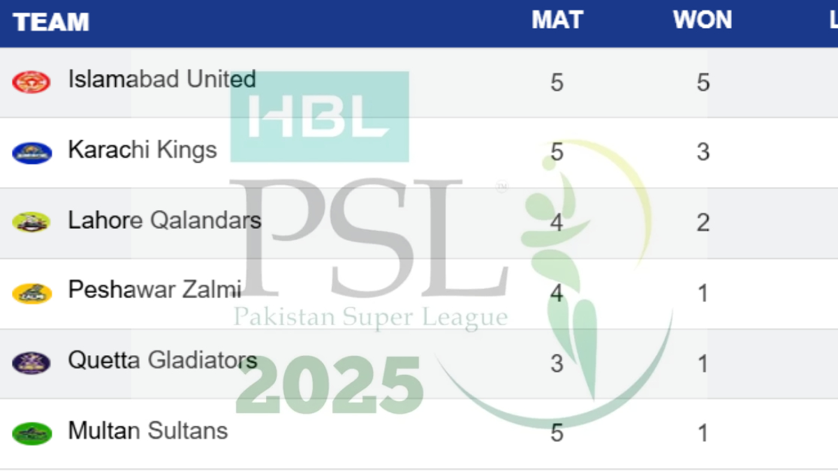| 1. Islamabad United | 5 | 5 | 0 | 0 | 0 | 10 | +2.342 |