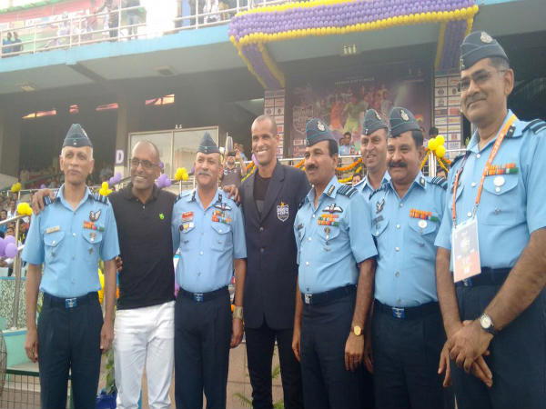 Rivaldo with Chief of Air Staff, Air Chief Marshal Arup Raha before Subroto Cup final kick off (Image courtesy: Ministry of Defence Twitter handle)