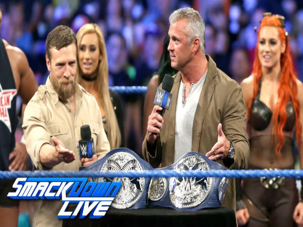 To match up with the flagship show i.e. Monday Night Raw, the commissioner Shane McMahon along with the General Manager of the show, Daniel Bryan unveiled the Women's championship and the tag team championship for Smackdown with the tag team division and the Women's division standing in the ring.